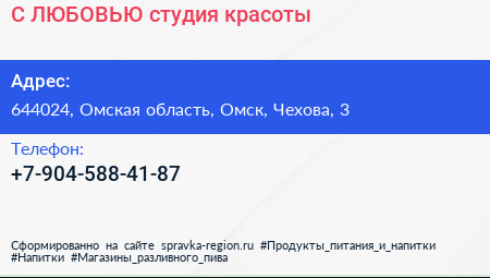 С ЛЮБОВЬЮ, студия красоты по адресу 644024, Омская область, Омск, Чехова, 3 в дальнейшем Организация, размещена в следующих категориях: