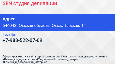 SEN, студия депиляции по адресу 644043, Омская область, Омск, Тарская, 14 в дальнейшем Организация, размещена в следующих категориях: