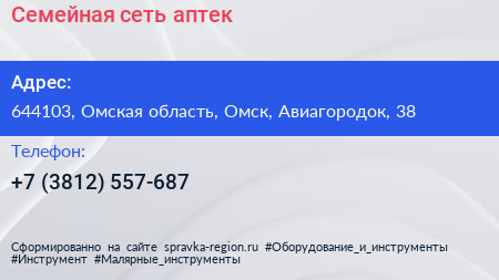 Семейная, сеть аптек по адресу 644103, Омская область, Омск, Авиагородок, 38 в дальнейшем Организация, размещена в следующих категориях: