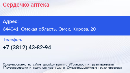 Сердечко, аптека по адресу 644041, Омская область, Омск, Кирова, 20 в дальнейшем Организация, размещена в следующих категориях: