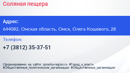 Соляная пещера по адресу 644082, Омская область, Омск, Олега Кошевого, 28 в дальнейшем Организация, размещена в следующих категориях:
