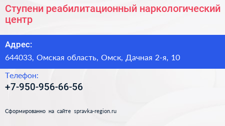 Ступени, реабилитационный наркологический центр по адресу 644033, Омская область, Омск, Дачная 2-я, 10 в дальнейшем Организация, размещена в следующих категориях: