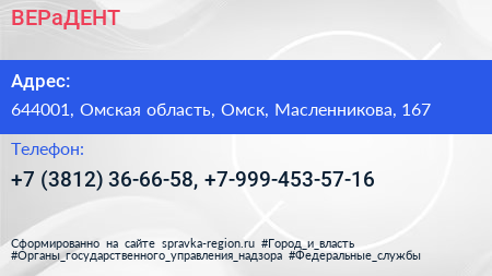ВЕРаДЕНТ по адресу 644001, Омская область, Омск, Масленникова, 167 в дальнейшем Организация, размещена в следующих категориях: