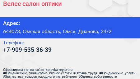 Велес, салон оптики по адресу 644073, Омская область, Омск, Дианова, 24/2 в дальнейшем Организация, размещена в следующих категориях: