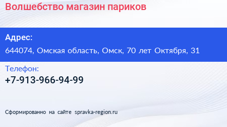 Волшебство, магазин париков по адресу 644074, Омская область, Омск, 70 лет Октября, 31 в дальнейшем Организация, размещена в следующих категориях: