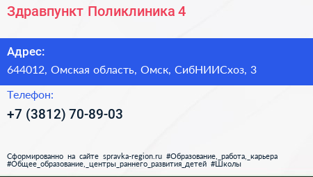 Здравпункт, Поликлиника №4 по адресу 644012, Омская область, Омск, СибНИИСхоз, 3 в дальнейшем Организация, размещена в следующих категориях: