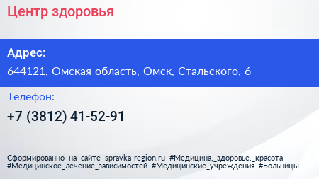 Центр здоровья по адресу 644121, Омская область, Омск, Стальского, 6 в дальнейшем Организация, размещена в следующих категориях: