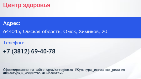 Центр здоровья по адресу 644045, Омская область, Омск, Химиков, 20 в дальнейшем Организация, размещена в следующих категориях:
