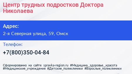 Центр трудных подростков Доктора Николаева по адресу 2-я Северная улица, 59, Омск в дальнейшем Организация, размещена в следующих категориях: