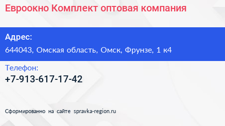 Евроокно-Комплект, оптовая компания по адресу 644043, Омская область, Омск, Фрунзе, 1 к4 в дальнейшем Организация, размещена в следующих категориях: