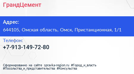 ГрандЦемент по адресу 644105, Омская область, Омск, Пристанционная, 1/1 в дальнейшем Организация, размещена в следующих категориях: