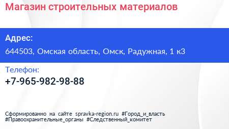 Магазин строительных материалов по адресу 644503, Омская область, Омск, Радужная, 1 к3 в дальнейшем Организация, размещена в следующих категориях: