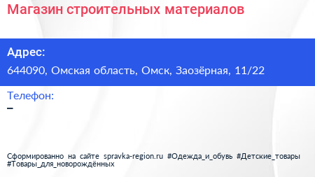 Магазин строительных материалов по адресу 644090, Омская область, Омск, Заозёрная, 11/22 в дальнейшем Организация, размещена в следующих категориях: