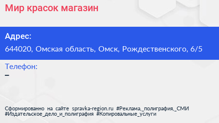 Мир красок, магазин по адресу 644020, Омская область, Омск, Рождественского, 6/5 в дальнейшем Организация, размещена в следующих категориях: