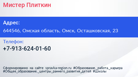 Мистер Плиткин по адресу 644546, Омская область, Омск, Осташковская, 23 в дальнейшем Организация, размещена в следующих категориях: