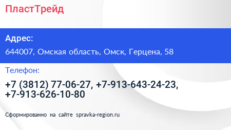 ПластТрейд по адресу 644007, Омская область, Омск, Герцена, 58 в дальнейшем Организация, размещена в следующих категориях: