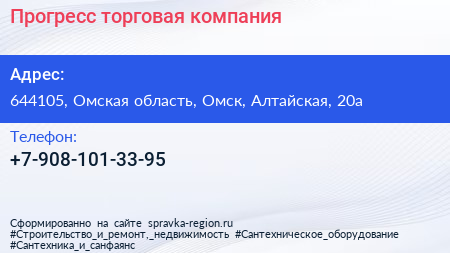 Прогресс, торговая компания по адресу 644105, Омская область, Омск, Алтайская, 20а в дальнейшем Организация, размещена в следующих категориях: