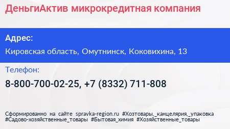 ДеньгиАктив, микрокредитная компания по адресу Кировская область, Омутнинск, Коковихина, 13 в дальнейшем Организация, размещена в следующих категориях: