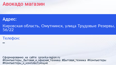 Авокадо, магазин по адресу Кировская область, Омутнинск, улица Трудовые Резервы, 56/22 в дальнейшем Организация, размещена в следующих категориях: