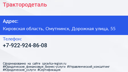 Трактородеталь по адресу Кировская область, Омутнинск, Дорожная улица, 55 в дальнейшем Организация, размещена в следующих категориях: