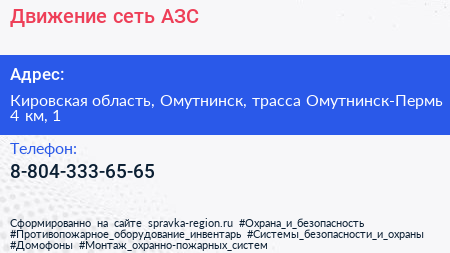 Движение, сеть АЗС по адресу Кировская область, Омутнинск, трасса Омутнинск-Пермь 4 км, 1 в дальнейшем Организация, размещена в следующих категориях: