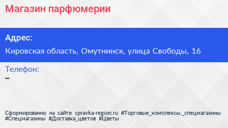 Магазин парфюмерии по адресу Кировская область, Омутнинск, улица Свободы, 16 в дальнейшем Организация, размещена в следующих категориях: