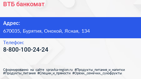 ВТБ, банкомат по адресу 670035, Бурятия, Онохой, Ясная, 134 в дальнейшем Организация, размещена в следующих категориях: