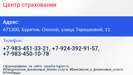 Центр страхования по адресу 671300, Бурятия, Онохой, улица Терешковой, 11 в дальнейшем Организация, размещена в следующих категориях: