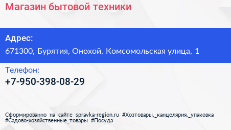 Магазин бытовой техники по адресу 671300, Бурятия, Онохой, Комсомольская улица, 1 в дальнейшем Организация, размещена в следующих категориях: