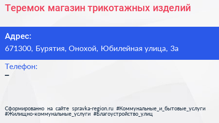 Теремок, магазин трикотажных изделий по адресу 671300, Бурятия, Онохой, Юбилейная улица, 3а в дальнейшем Организация, размещена в следующих категориях: