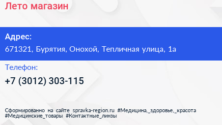 Лето, магазин по адресу 671321, Бурятия, Онохой, Тепличная улица, 1а в дальнейшем Организация, размещена в следующих категориях:
