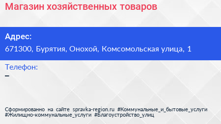Магазин хозяйственных товаров по адресу 671300, Бурятия, Онохой, Комсомольская улица, 1 в дальнейшем Организация, размещена в следующих категориях: