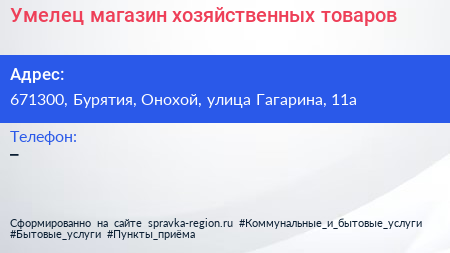 Умелец, магазин хозяйственных товаров по адресу 671300, Бурятия, Онохой, улица Гагарина, 11а в дальнейшем Организация, размещена в следующих категориях: