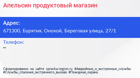 Апельсин, продуктовый магазин по адресу 671300, Бурятия, Онохой, Береговая улица, 27/1 в дальнейшем Организация, размещена в следующих категориях: