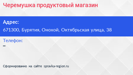 Черемушка, продуктовый магазин по адресу 671300, Бурятия, Онохой, Октябрьская улица, 38 в дальнейшем Организация, размещена в следующих категориях: