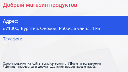 Добрый, магазин продуктов по адресу 671300, Бурятия, Онохой, Рабочая улица, 19Б в дальнейшем Организация, размещена в следующих категориях: