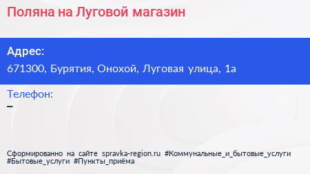 Поляна на Луговой, магазин по адресу 671300, Бурятия, Онохой, Луговая улица, 1а в дальнейшем Организация, размещена в следующих категориях: