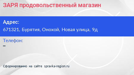 ЗАРЯ, продовольственный магазин по адресу 671321, Бурятия, Онохой, Новая улица, 9д в дальнейшем Организация, размещена в следующих категориях: