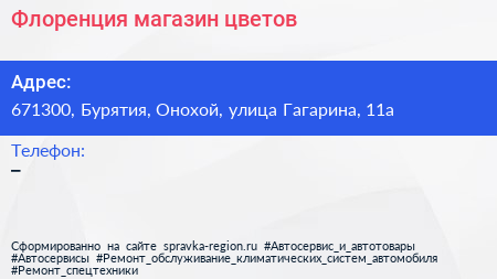 Флоренция, магазин цветов по адресу 671300, Бурятия, Онохой, улица Гагарина, 11а в дальнейшем Организация, размещена в следующих категориях: