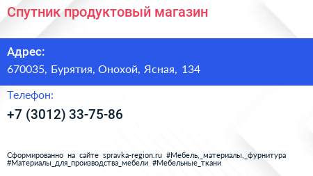 Спутник, продуктовый магазин по адресу 670035, Бурятия, Онохой, Ясная, 134 в дальнейшем Организация, размещена в следующих категориях:
