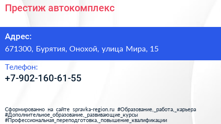 Престиж, автокомплекс по адресу 671300, Бурятия, Онохой, улица Мира, 15 в дальнейшем Организация, размещена в следующих категориях: