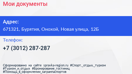 Мои документы по адресу 671321, Бурятия, Онохой, Новая улица, 12Б в дальнейшем Организация, размещена в следующих категориях: