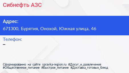 Сибнефть, АЗС по адресу 671300, Бурятия, Онохой, Южная улица, 46 в дальнейшем Организация, размещена в следующих категориях: