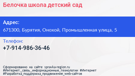 Белочка, школа-детский сад по адресу 671300, Бурятия, Онохой, Промышленная улица, 5 в дальнейшем Организация, размещена в следующих категориях: