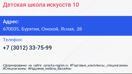Детская школа искусств №10 по адресу 670035, Бурятия, Онохой, Ясная, 28 в дальнейшем Организация, размещена в следующих категориях: