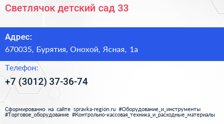 Светлячок, детский сад №33 по адресу 670035, Бурятия, Онохой, Ясная, 1а в дальнейшем Организация, размещена в следующих категориях: