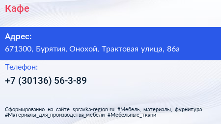 Кафе по адресу 671300, Бурятия, Онохой, Трактовая улица, 86а в дальнейшем Организация, размещена в следующих категориях: