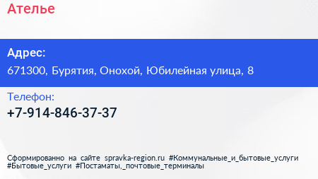Ателье по адресу 671300, Бурятия, Онохой, Юбилейная улица, 8 в дальнейшем Организация, размещена в следующих категориях: