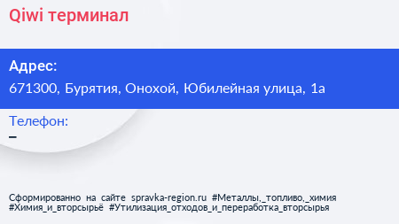 Qiwi, терминал по адресу 671300, Бурятия, Онохой, Юбилейная улица, 1а в дальнейшем Организация, размещена в следующих категориях: