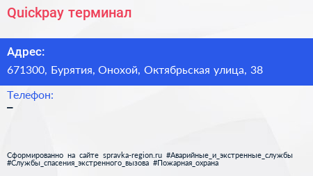Quickpay, терминал по адресу 671300, Бурятия, Онохой, Октябрьская улица, 38 в дальнейшем Организация, размещена в следующих категориях: